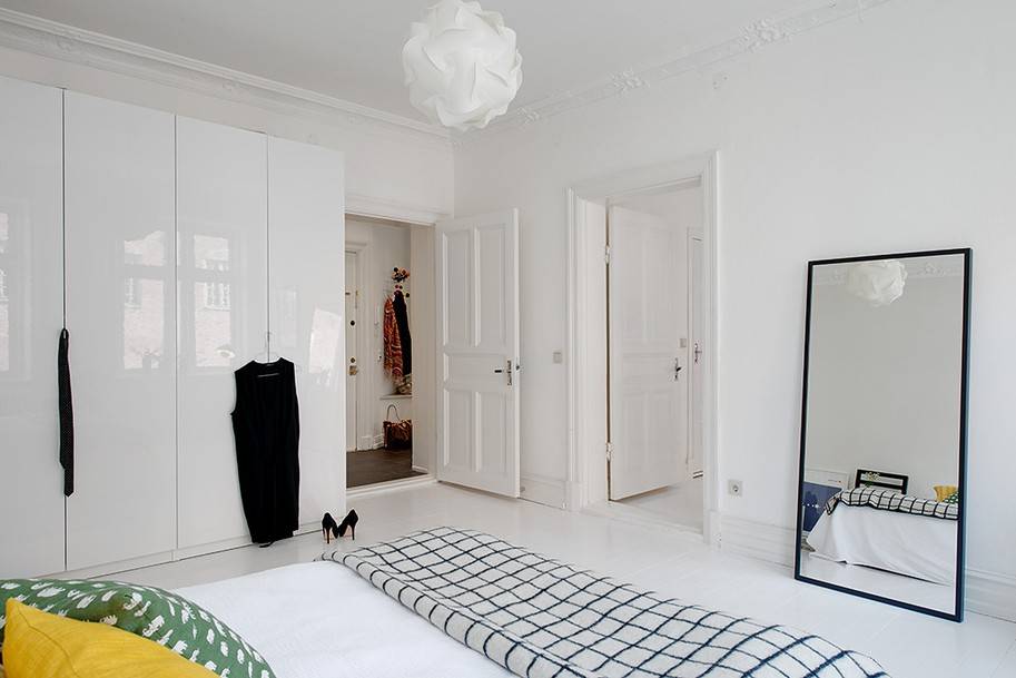 Натуральные деревянные конструкции, окрашенные в светлые тона с сохранением древесной фактуры, простые филенчатые изделия, модели, декорированные стеклянными, зеркальными вставками и металлической фурнитурой, наиболее предпочтительны для сканди-интерьера.