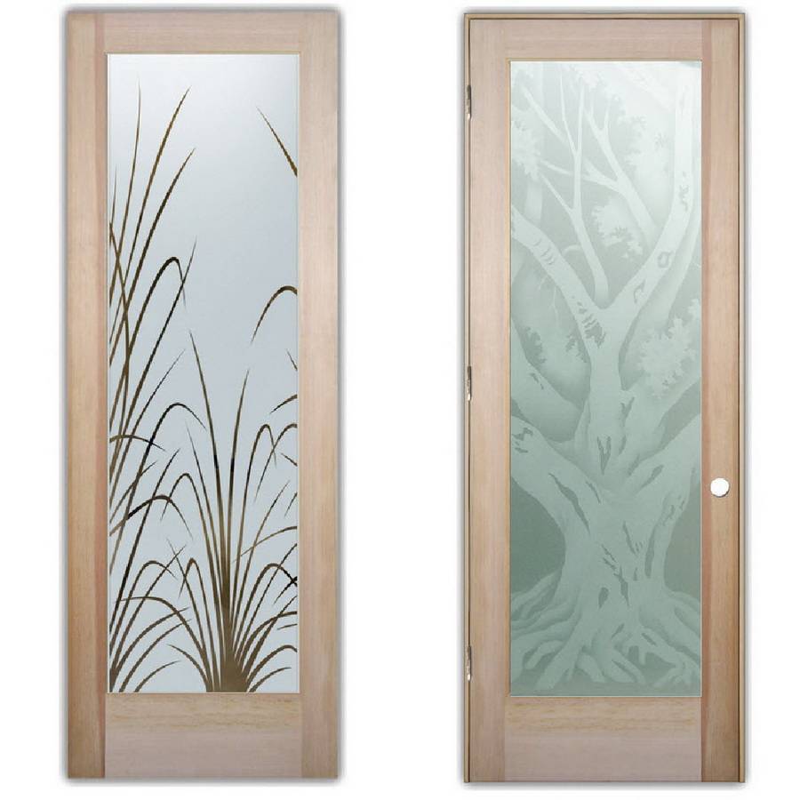 Стеклянные вставки не редкость, особенно витражи с натуральными мотивами. Наличники могут иметь неправильную форму, а створка может состоять из геометрических фигур. В этом стиле отлично смотрятся глянцевые поверхности.