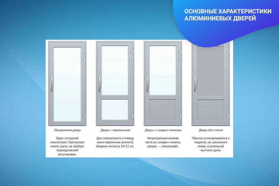 Технология изготовления алюминиевых дверей исключает наличие зазоров. Профильные элементы, которые используются при выполнении подобных полотен, могут различаться своими геометрическими и физическими характеристиками в зависимости от эксплуатационной принадлежности изделия.