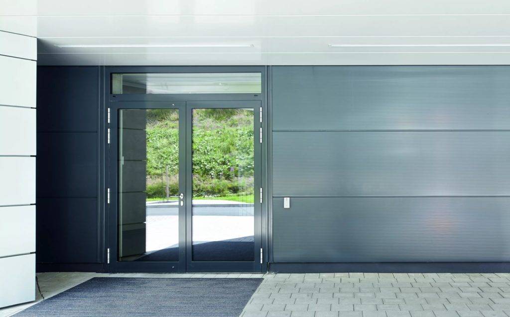 В случае расположения дверей для входа на одной стороне здания, можно сочетать их по оформлению. Дизайнеры объединились с архитекторами и секционные ворота пополнились блоками из прочной стали в сочетании с алюминием. Такие конструкции представляют тонкостенную стальную оболочку с вставленными сэндвич-панелями толщиной порядка 30-40 мм. Двери имеют минус — конструкция такова, что в некоторых местах образуются мостики холода, что означает промерзание и образование наледи в притворной зоне.