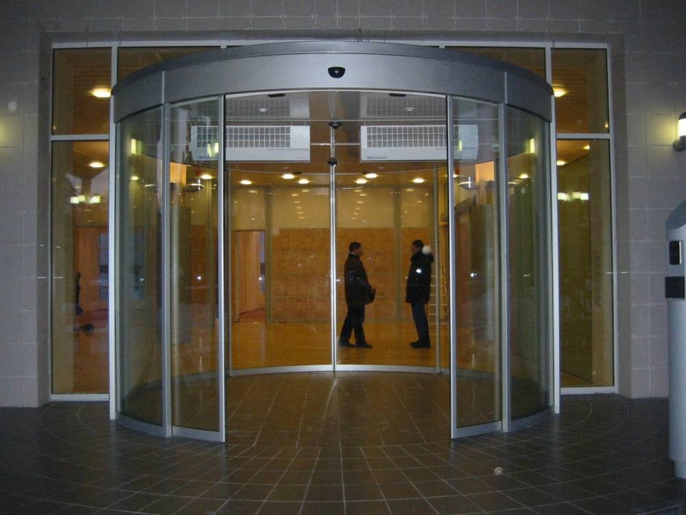 Также широкое применение получили двери из алюминиевого профиля с карусельной системой хода. Их установка оправдана в местах большого потока людей. Использование такого типа конструкций позволяет защитить помещение от проникновения сквозняков и сора.
