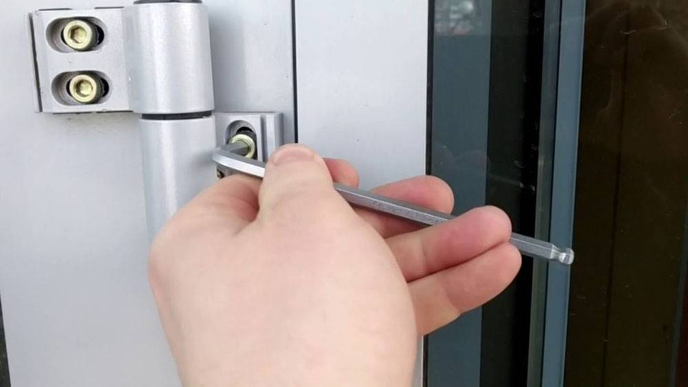 - Двери с тремя петлями регулируются по силе примыкания. Следует повернуть винт шестигранным ключом с внутренней стороны створки поперёк оси. Затем отрегулировать и выровнять нижнюю петлю по вертикали и в плоскости.