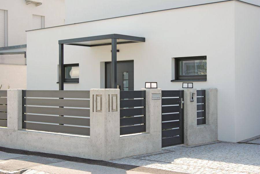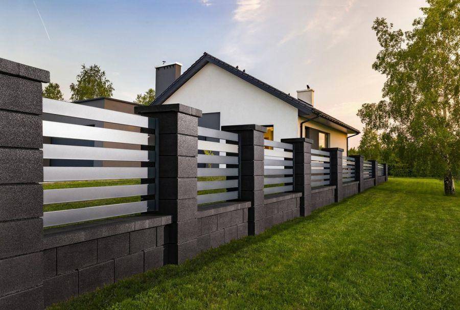 Выбор конструкции — прерогатива владельца. Здесь надо совместить собственные предпочтения, финансовые и технические возможности, а также учесть специфику участка (рельеф, стилистика оформления и т. п.). Можно несколько уменьшить количество алюминиевых деталей, если выбрать конструкцию с ленточным фундаментом и бетонными столбами. Однако самым экономным вариантом станет сборка сплошного полотна из алюминиевого профлиста с ПИКС (панели – имитация кирпичных столбов). Они недорогие, но способны весьма существенно изменить унылый облик сплошного полотна.