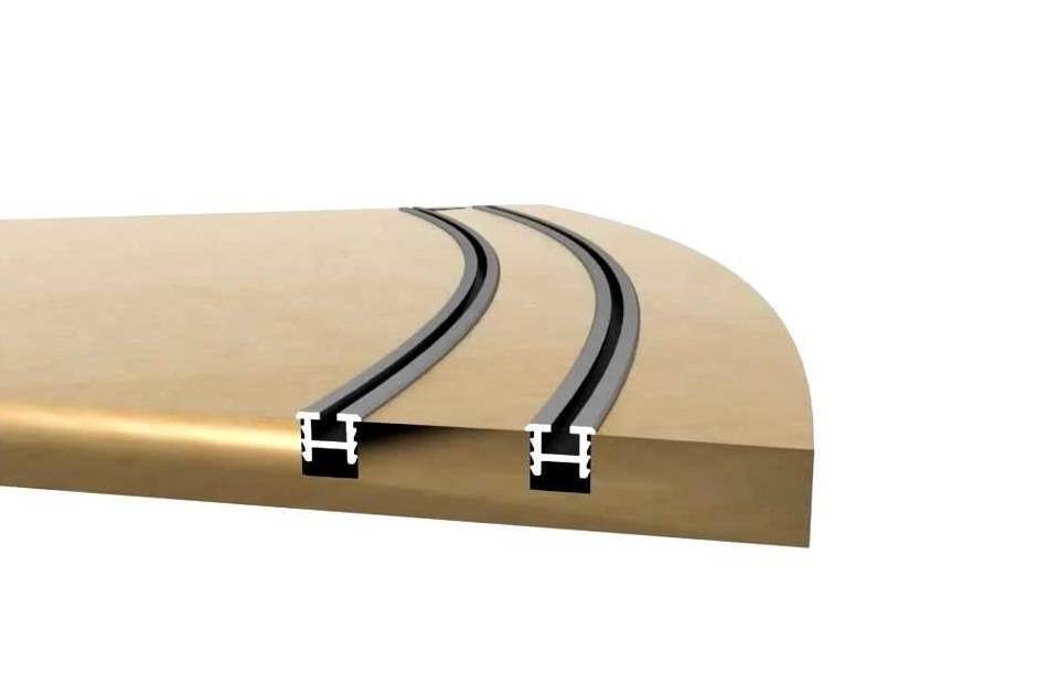 Помимо направляющих, прикрепленных к поверхности пола, двери можно устанавливать и на специальный рельс. При таком решении полотно двери будет расположено несколько выше линии пола.