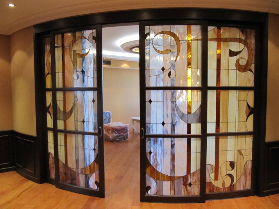 В частых случаях дизайнерская фантазия может сочетать несколько видов дверных блоков в одной перегородке. К примеру, одни радиусные двери могут сочетать в себе не только раздвижные, но и распашные и даже неподвижные полотна.