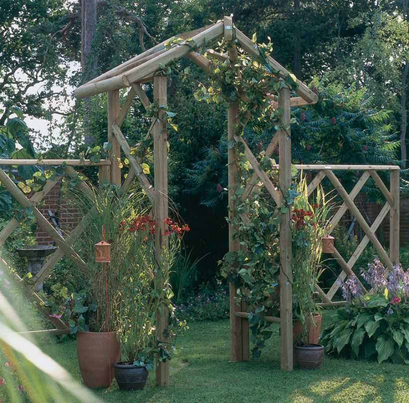 Деревянные арки можно сделать совсем недорого, если использовать остатки дерева от строительства дома или сарая. Хорошо будут выглядеть решетки, ивняк, ветви.