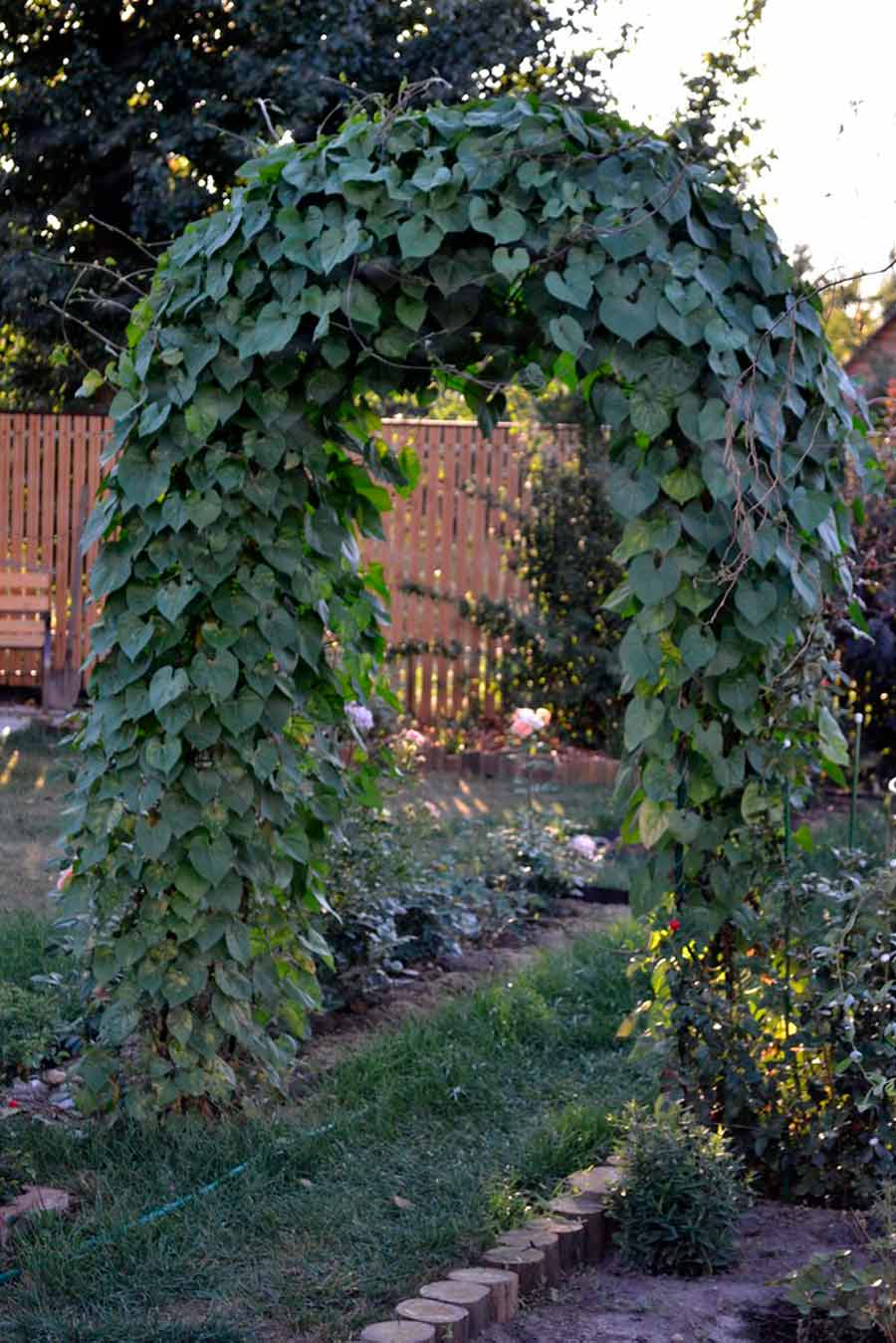 Самые простые и практически не требующие ухода плющ и виноград. Плющ, это вечнозеленое растение, неприхотливое и морозоустойчивое, так что будет украшать вашу арку круглый год. Правда плющ растет довольно медленно, так что только через несколько лет можно будет полюбоваться результатом. Если не хотите ждать, посадите виноград, есть много декоративных сортов, например, девичий, его листья очень красивые осенью или Куанье, с красивыми резными листочками.