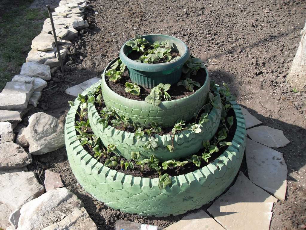 Если остались старые автомобильные покрышки, то можно их использовать для вертикального выращивания клубники