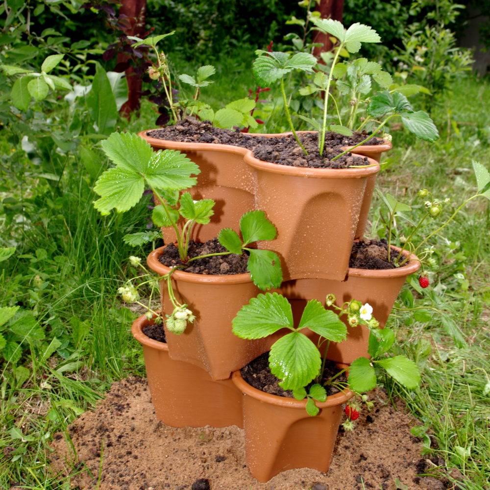 Пирамиду для выращивания клубники можно сформировать из обычных горшков под цветы