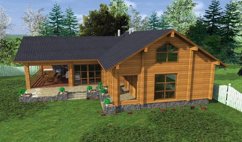 Автор проекта предлагает возводить постройку из керамоблока (он отличается высокой прочностью, долговечностью и теплоизоляционными качествами), отделывать стены штукатуркой, а крышу перекрывать металлочерепицей. Данное решение отлично подойдет для больших семей, а также для любителей провести время в большой компании – парковочных мест и пространства для отдыха более, чем достаточно.