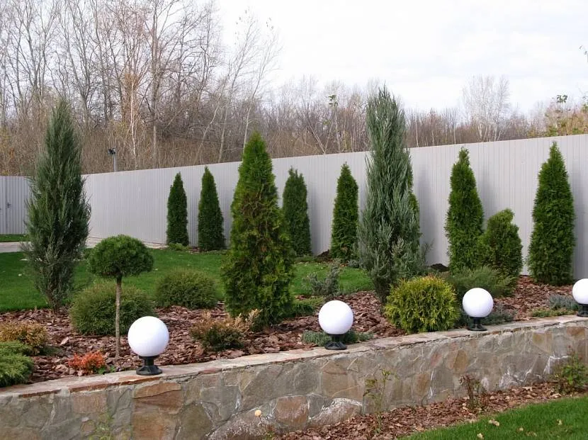 Декоративный сад для оформления территории вдоль забора хвойными мини-культурамиИсточник roomester.ru