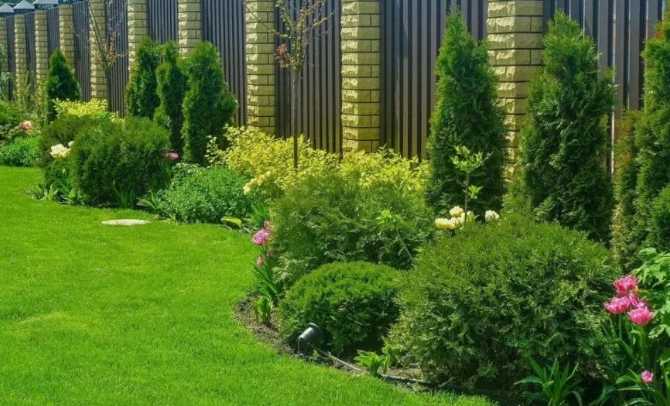 Хвойные растения в клумбе возле металлического забора внутри придомовой территорииИсточник yandex.ru