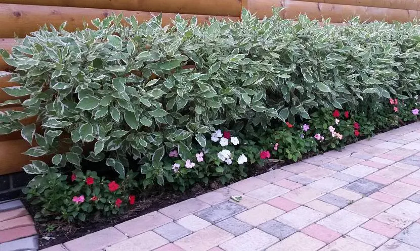 Любимцем у владельцев дачи является дерен. Он быстро растет, литья окрашены в серебристый цвет с белой окантовкой. Если весной посадить несколько кустиков, то к осени можно получить готовую живую изгородь высотой до 1 метра. Нужно учитывать то, что дерен требует весьма много места, поэтому сочетать его с другими кустарниками не получится.