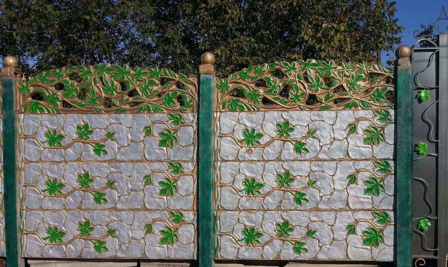 В продаже имеются панели с разными вариантами расцветки и рельефа. В верхней части ограждений часто устанавливают плиты с ажурными декоративными элементами, способными придать забору стильный и привлекательный вид. Вариантов расцветки может быть великое множество.
