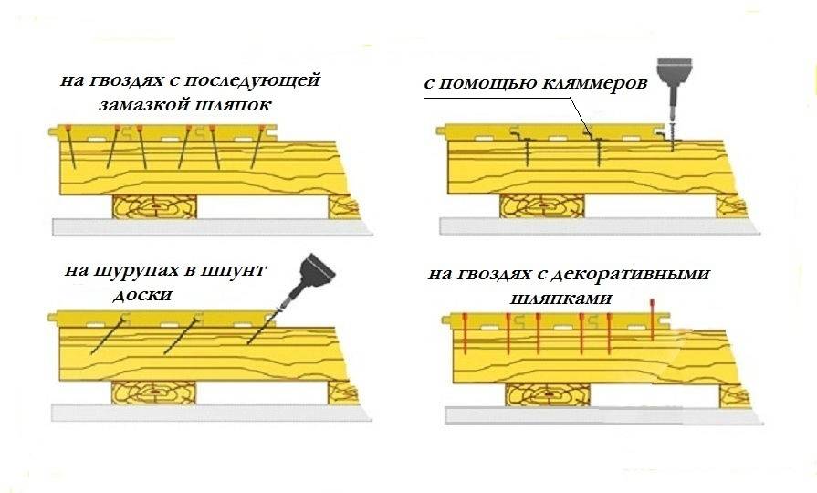 Затем обеспечьте гидроизоляцию и разместите лаги на расстоянии 400 мм друг от друга. После чего разместите маячные лаги на расстоянии двух метров. Закрепите каркас и приступайте к монтажу самих досок. Доски необходимо уложить перпендикулярно лагам. Доски могут иметь немного изогнутую форму, поэтому используйте при укладке метод беззазорного стыка. Старайтесь укладывать доски поочередно: сначала выпуклую, затем вогнутую. В завершение следует выровнять доски и затем нанести клеевой раствор.