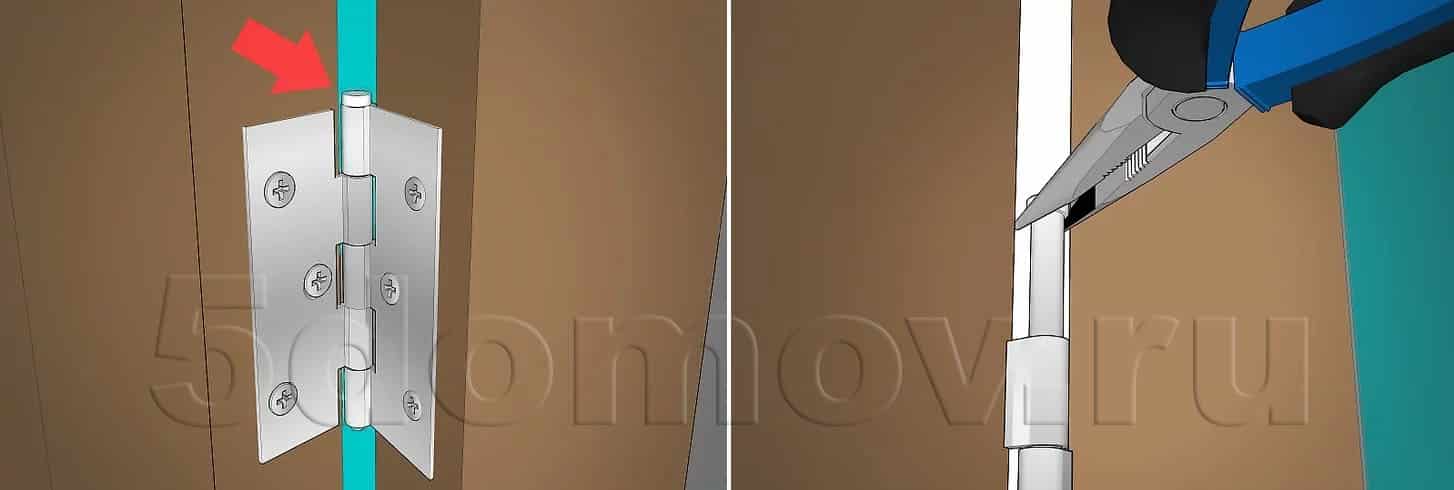 Для приподнимания дверного полотна на навесах используется метод рычага: это позволит обнажить внутренность петель. В их состав входят два элемента, соединенные с помощью стержня: для достижения хорошего эффекта смазывания его рекомендуется извлечь, проворачивая плоскогубцами против часовой стрелки