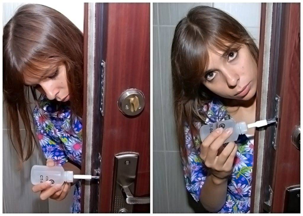 Разберем, как смазать замок на примере входной металлической двери, снабженной цилиндрической личинкой. Перед операцией необходимо очистить замочную скважину. Для этого заранее приобретается специальная жидкость. Ее нужно залить в щель для ключа. Лучше не жалеть средства, чтобы оно выливалось наружу от переизбытка, вынося с собой весь мусор, накопившийся внутри.