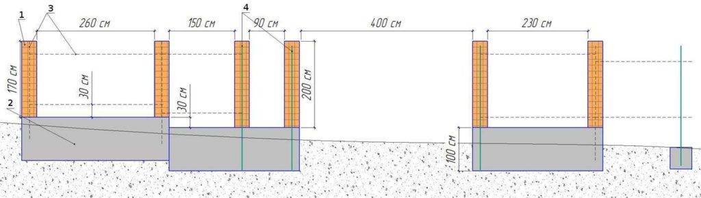 Забор из профнастила с фундаментом ленточного типа используется и для комбинированного ограждения из кирпича и профнастила.