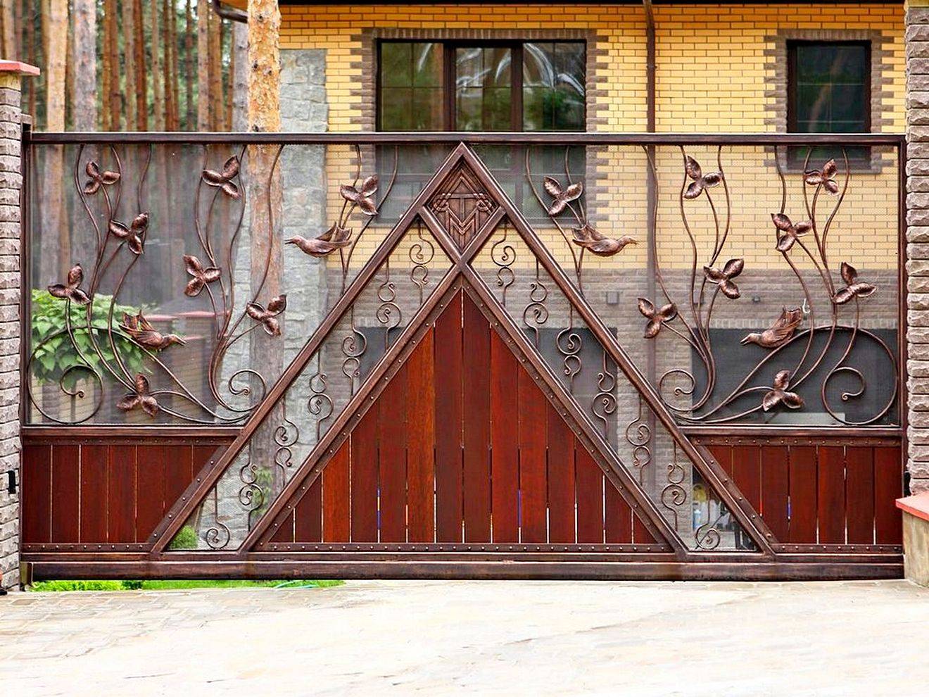 Ворота могут быть не только металлическими, многие делают их из древесины, а кто-то выбирает комбинированный вариант. На них можно добавлять украшения в виде резных элементов. Все это зависит только от хозяев.