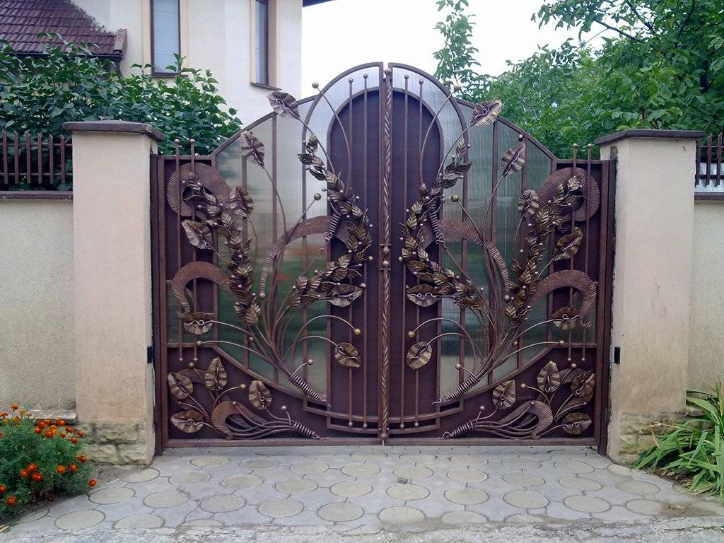 Ворота из профлиста дополняются разными коваными элементами: пиками, завитками, спиралями, виноградной лозой, цветочными мотивами, листьями и лианами. Помимо узоров изделие можно дополнительно украсить: