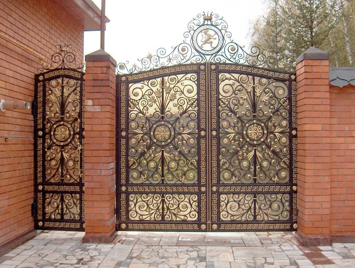 Ручками. Такие элементы подойдут под классические мотивы. К преимуществам кованых ручек относятся: прочность, надежность, долговечность, практичность и функциональность. По разновидностям они делятся: на стационарные (надежно закрепленные на дверном полотне для обеспечения удобства при открывании и закрывании), нажимные (оснащаются защелкой или замком, что позволяет закрыть ворота или калитку на замок). По формам декоративные ручки бывают: прямыми и строгими, декоративными с изогнутыми завитками.