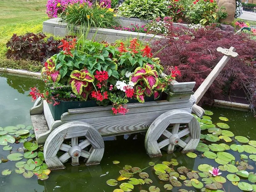 Часто используются специальные дизайнерские приемы: декорирование клумб гравием, камнями, деревом. Также нередко владельцы проявляют фантазию и в ход идут подручные материалы (автомобильные покрышки, кованые элементы, бутылки, тележки, цветочные горшки). Из сарая выходят на свет садовые фигуры, механизмы и старинная утварь. Дизайнеры находят применение даже потертому ботинку.