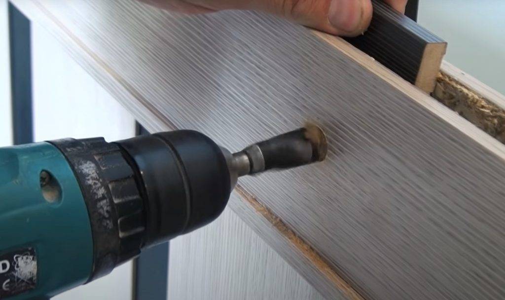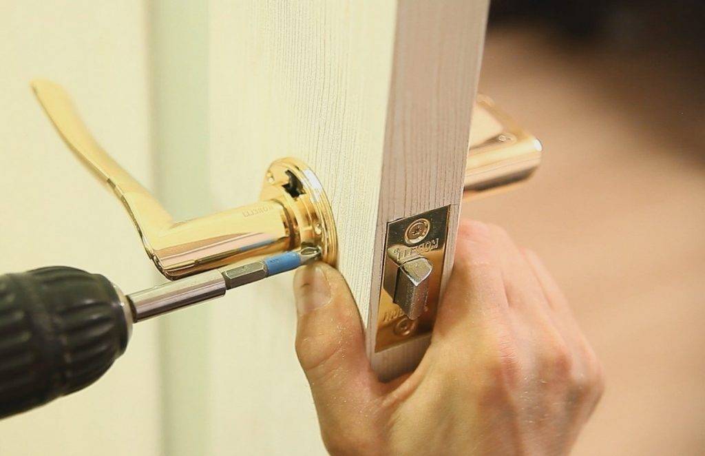- В торец двери, с помощью фрезера и стамесок, врезается ригель с запирающим механизмом, а на поверхность полотна устанавливается ручка.