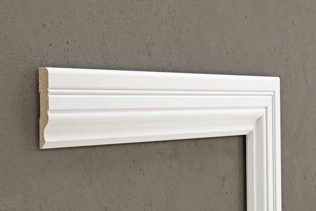 Трудно рассчитать зазор под применяемый сейчас наличник, различного профиля и толщиной всего от 6 до 12 мм. Скруглённые углы самой коробки и наличника, могут сыграть злую шутку, оставив незакрытый участок. Эти проблемы решаются путём максимального снятия слоя штукатурки или вырубки стены, в районе наличника и максимального углубления ламели с сохранением лишь минимального зазора. Доска ламината получается немного врезанной в стену.