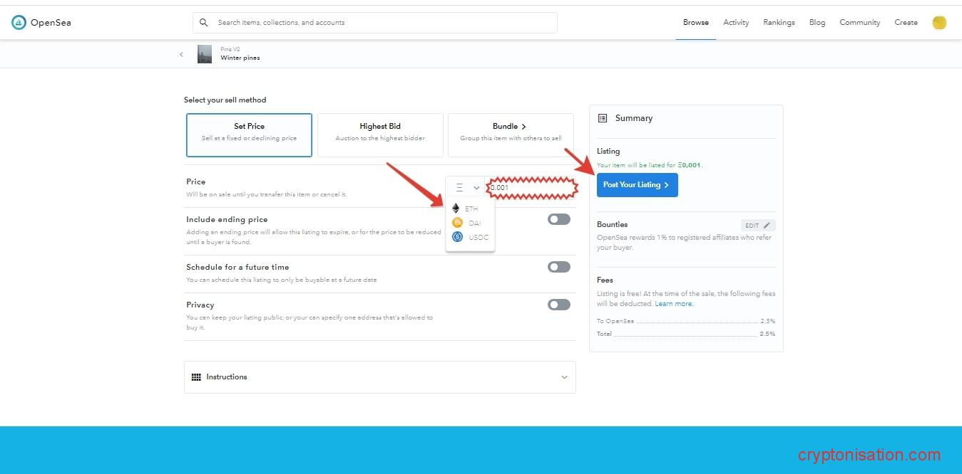 Продажи на Opensea, как правило, проводятся в формате аукциона. Выбираем валюту, за которую хотим продать токен → назначаем первоначальную цену (например, 0,001 ETH) → жмем Post Your Listing.