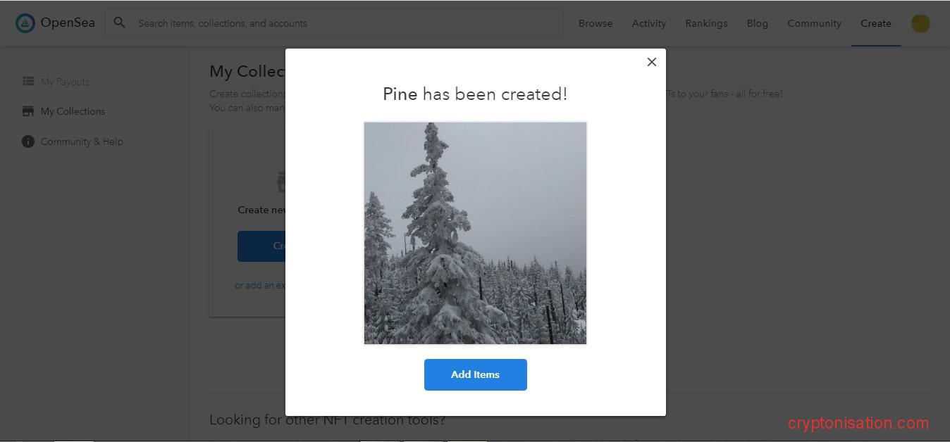 После того, как коллекция создана, жмем Add Items и переходим к созданию самого токена (система также попросит подтвердить электронную подпись посредством электронного кошелька, после чего откроется страница для создания NFT).