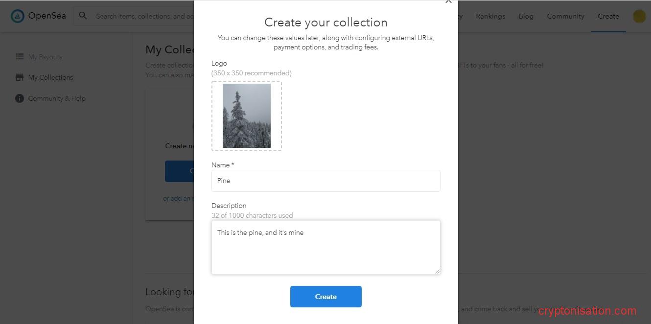 Загружаем логотип коллекции → вписываем название и описание → жмем Create.