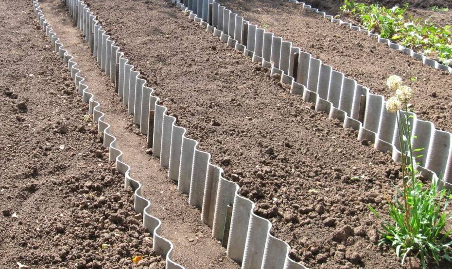 Многие видели бордюры из шифера, такое можно осуществить собственноручно без больших усилий. Волновой материал является доступным, и с его помощью можно создавать аккуратные грядки, поэтому его можно выбрать для огорода. Для создания одинаковых полос необходимо использовать 60-сантиметровые колья, обработанные с одной стороны мастикой. Понадобится распилить шифер на одинаковые части, используя болгарку.