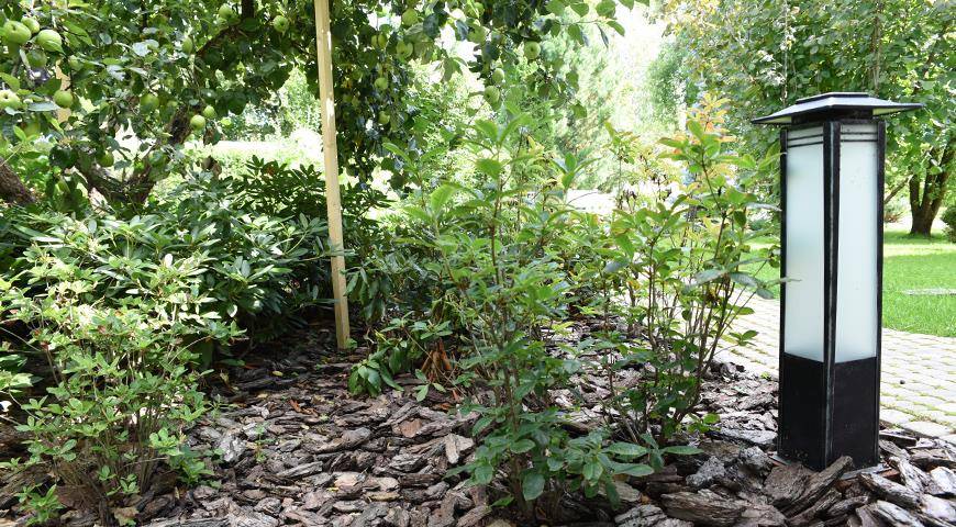 Оригинальное плетение особенно органично впишется в ландшафт, дополненный фруктовыми деревьями и кустарниками.