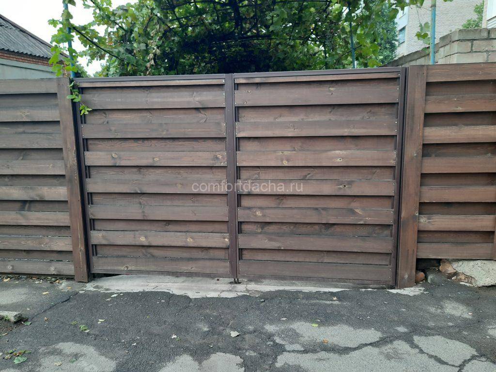 Столбы для такого забора делают из бруса не менее 80*80 мм, но более долговечны из профилированной трубы. Размер 60*80 мм или 40*80 мм, можно брать квадратные. Зависит от того, как будете крепить доску. Пролет между опорами — 2,5-3 метра, а между ними ставят промежуточную — из бруса 40*40 мм или около того. Точно пролет определяется по месту и часто зависит от гибкости доски.
