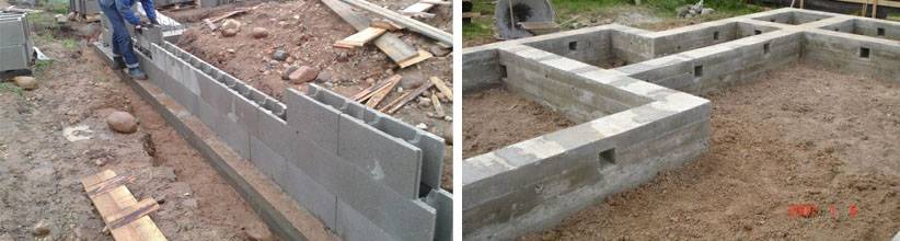 - Установка шлакоблоков, пеноблоков или газосиликатных блоков. Лента основания, выполненная из шлакоблоков, отличается значительной прочностью и простотой монтажа, однако имеет плохую теплоизоляцию. Из-за этого система будет нуждаться в дополнительном утеплении, что увеличит затраты на строительство. Газосиликатные блоки обладают высокой устойчивостью к низким температурам, однако имеют невысокую прочность, поэтому подходят только для строительства мелко заглубленных конструкций. Фундамент для гаража из пеноблоков обладает малым весом и низкой ценой, также отличается низкой прочностью, склонностью к усадке. Такой метод может применяться исключительно для возведения легких каркасных сооружений, устанавливаемых на твердых непучинистых почвах.