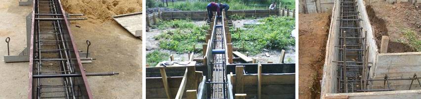 Для упрочения фундамента и придания ему жесткости используют армирующие элементы (стальные прутки), связанные между собой.