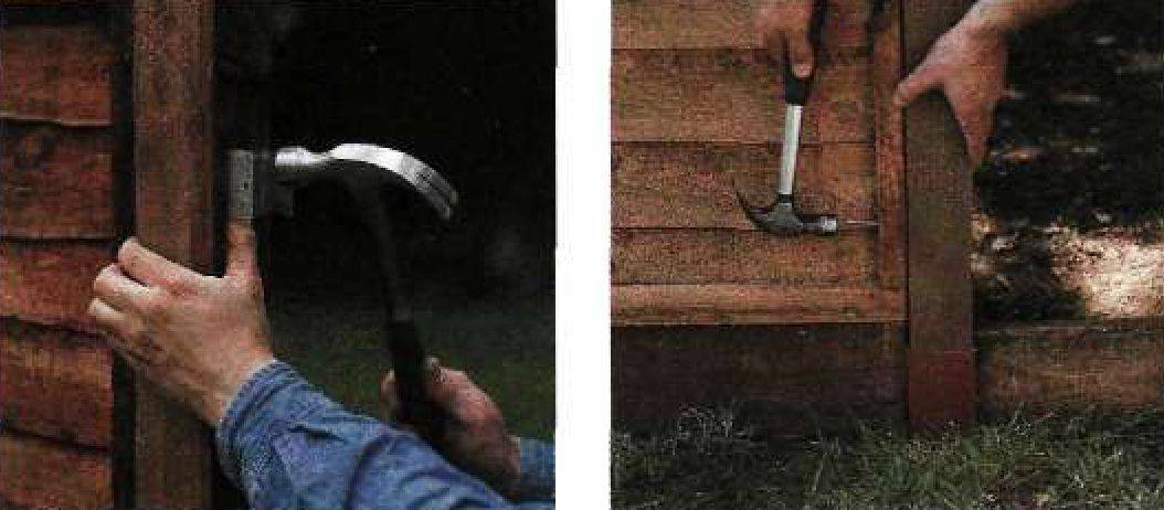 Если использованы винтовые зажимы, то заменить старую секцию на новую будет гораздо легче, поскольку секции прикручиваются к этим хомутам винтами. Если такая секция прибита гвоздями, вы можете повредить ее гвоздодером. Новая секция забора должна точно вписаться в пространство между столбами — тогда ее можно крепить прежним способом.
