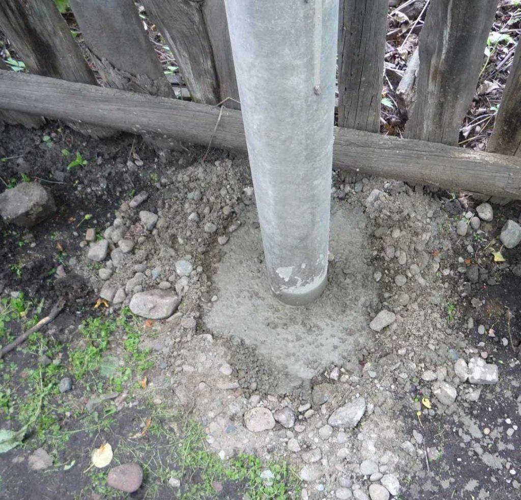 Столбы из бревен или труб вставляют в яму, фиксируют и заливают бетоном так, чтобы раствор был на уровне с землей.