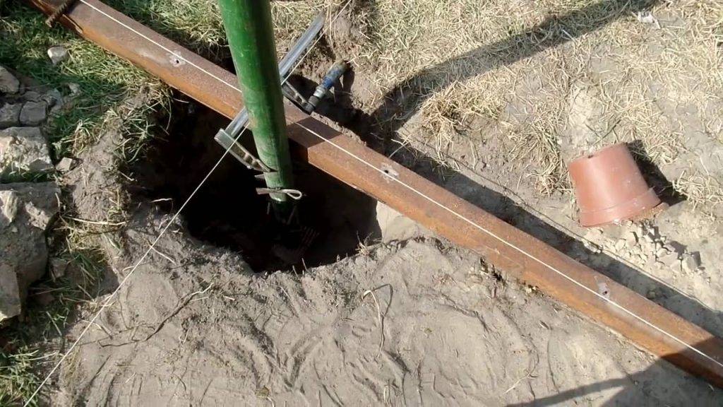 На дно каждой из них насыпаются в два слоя песок и щебень в качестве защитной подушки. Слои нужно утрамбовать для достижения лучшего эффекта. После этого в ямы устанавливаются столбы, вертикальность их установки необходимо проверять с помощью строительного уровня, причём лучше использовать водяной. Для достижения наибольшей прочности установки пространство, которое образуется между столбом и стенками ямы, следует заполнить щебнем. В целях экономии средств можно использовать колотый кирпич. После заполнения половины пространства щебень нужно утрамбовать, после чего досыпать ещё и снова утрамбовать, так нужно делать до наполнения всей ямы.