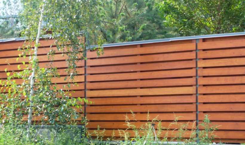 - Горизонтально установленная строганная доска на металлических или кирпичных опорах. Предполагает создание глухих заборов. Ограждение может быть выполнено в стиле «решетка», «елочка», «кросс», «лесенка». Новомодное направление в строительстве деревянных заборов.