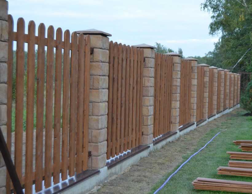 Опорные столбы для забора из штакетника делают не только из дерева. Нередко для их создания используют камень, металл или кирпич. Такая конструкция выглядит привлекательнее и является более долговечной.