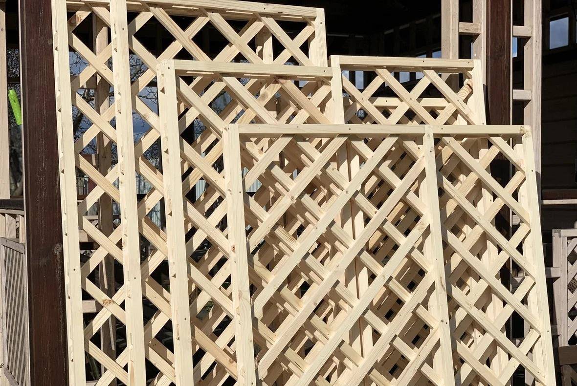 Решетчатое полотно получается путем крепления к перекладинам реек, перекрещенных перпендикулярно или же под углом. В качестве опор применяется не только дерево, но и профильные трубы 60*80 мм.