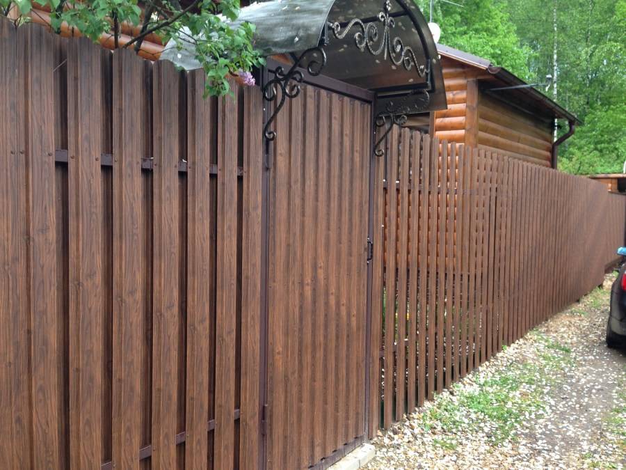Профнастил благородных коричневых оттенков хорошо сочетается с кирпичными столбиками-опорами.