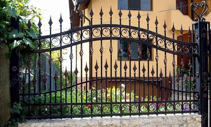 - Кованый забор. Раньше ковку могли позволить себе исключительно зажиточные граждане, ведь она выполнялась опытными мастерами вручную. Сегодня же кованые детали делают на заводах с помощью специального оборудования, поэтому их цена стала доступнее. Эта идея забора понравится тем, кто ищет декоративность, хочет украсить свою территорию, не любит простых решений. Недостатки у кованой конструкции такие же, как у трубной: прозрачность, отсутствие звукопоглощения.
