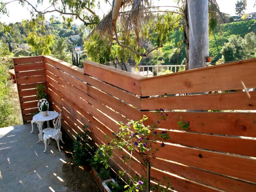Дерево безупречно сочетается с другими натуральными материалами – камнем, кирпичом, металлом. В современных экстерьерах оно гармонирует с бетоном или стеклом. Такие заборы требуют фундамента и подготовки, но зато станут самостоятельным украшением твоего участка.