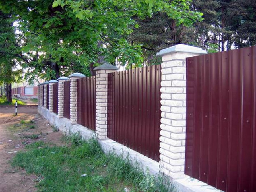 В продаже можно найти панели для забора из профнастила под желтый, белый или красный кирпич. Панели, в отличие от кирпича или камня, дешевы, не размокают и не разрушаются от атмосферной влаги. Панелями можно декорировать не только столбы, но и фундамент. Их легко устанавливать, они имеют малый вес и не требуют никакого ухода. Опыт применения показывает, что панели сохраняют хороший внешний вид долгие годы.