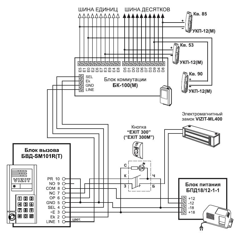 Схема подключения домофона координатно-матричного типа более простая надежная, поэтому пользуется большей популярностью. К координатному устройству связи подключен коммутатор, который при вызове переключает сигнал на конкретную трубку. Подключение производится при помощи проводов десяток и единиц, т. е. каждая квартира обозначена двумя кабелями, номера которых не повторяются. Чтобы установить связь, сигнал подается по линии DAT1 к коммутатору. После этого модулятор преображает и обрабатывает полученную информацию и подключается к одной определенной «Единице» и одному «Десятку». После благодаря электромагнитному реле по телефонной линии LIN происходит соединение с определенной квартирой.