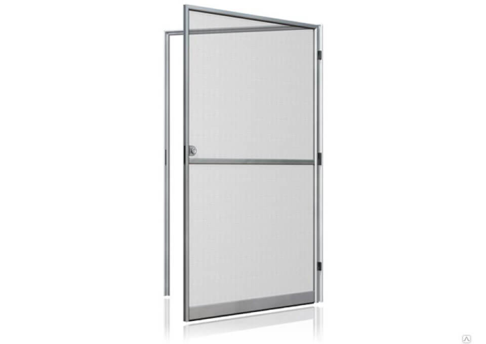 Дверные конструкции на петлях имеют прочный каркас из алюминиевого профиля, ширина которого больше дверного проема. Это простая и надежная, удобная в эксплуатации конструкция. Недостатком ее является потребность в свободном пространстве для обеспечения хода сетки.