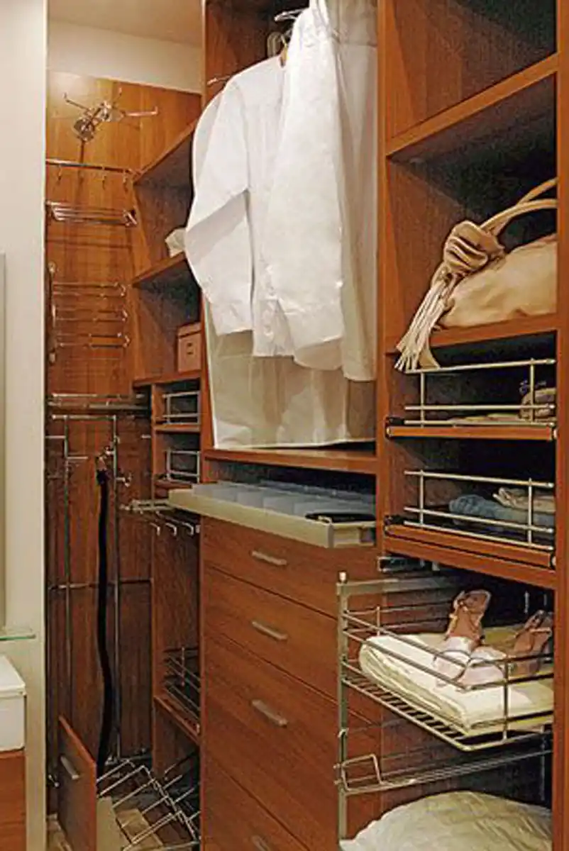 Выдвижные и стационарные аксессуары помогают максимально рационально использовать пространство гардеробной