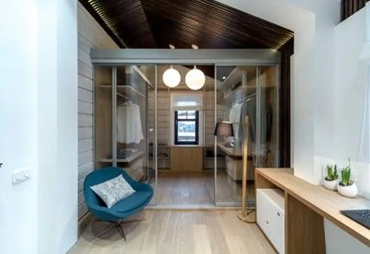 - Сделать стеклянную стенку. Она защитит одежду от пыли и не «съест» пространство.